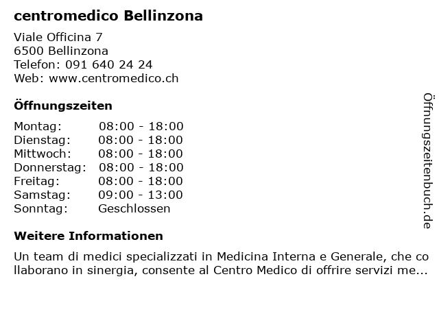 | Öffnungszeiten centromedico Bellinzona in Bellinzona anzeigen | |