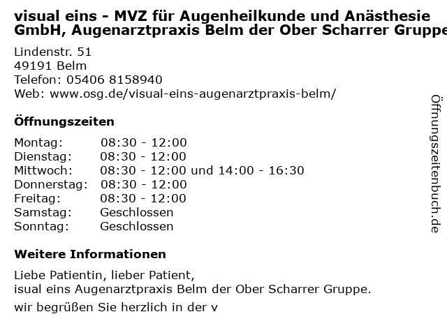 Branchen & Suchbegriffe zu visual eins - MVZ für Augenheilkunde und Anästhesie GmbH, Augenarztpraxis Belm der Ober Scharrer Gruppe:anästhesie, augenarztpraxis, augenheilkunde, belm, eins, gruppe, mvz, ober, scharrer, visual |