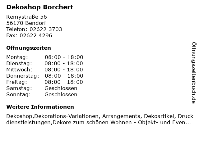 | Öffnungszeiten Dekoshop Borchert in Bendorf anzeigen | |