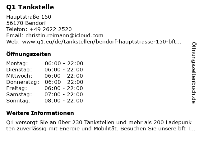 | Öffnungszeiten Q1 Tankstelle in Bendorf anzeigen | |