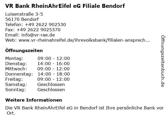 Branchen & Suchbegriffe zu VR Bank RheinAhrEifel eG Filiale Bendorf:bank, beratung, eg, geldautomat, genossenschaft, immobilienagentur, kredit, rheinahreifel, versicherung, vr |