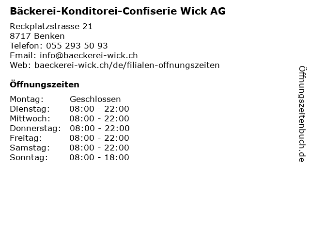 2 Bäckerei-Konditorei-Confiserie Wick AG (Entfernung: 13,53 km) Alte Jonastrasse 80, 8640 Rapperswil SG 3 Bäckerei-Konditorei-Confiserie Wick AG (Entfernung: 14,09 km) Untere Bahnhofstrasse 24, 8640 Rapperswil SG 6 |