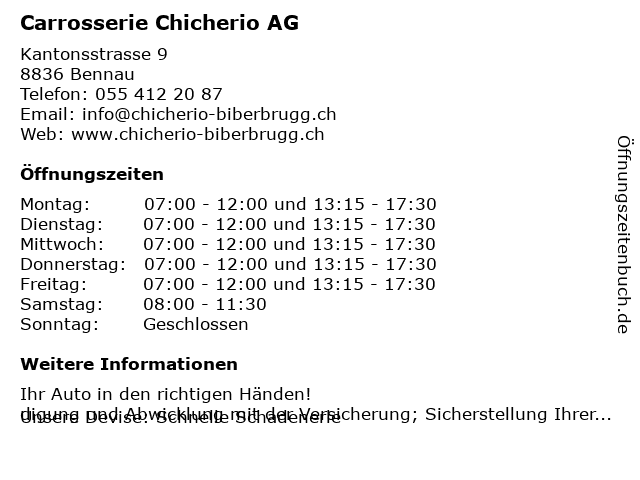 | Öffnungszeiten Carrosserie Chicherio AG in Bennau anzeigen | |