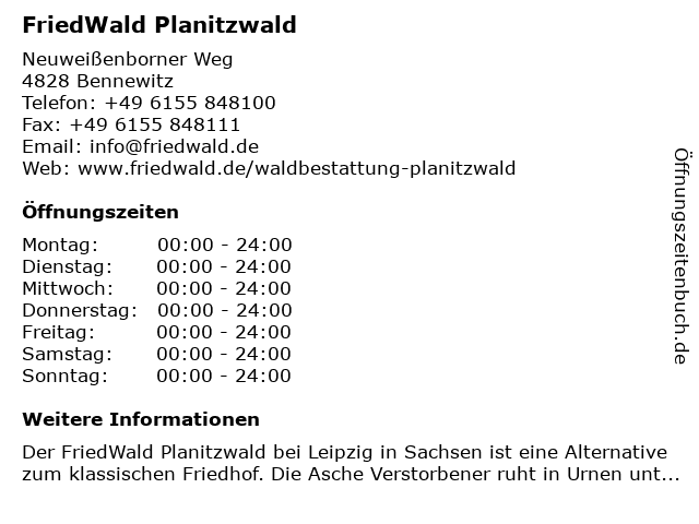 | Öffnungszeiten FriedWald Planitzwald in Bennewitz anzeigen | |