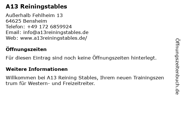 | Öffnungszeiten A13 Reiningstables in Bensheim anzeigen | |