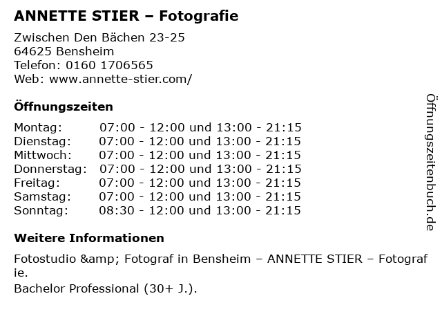 | Öffnungszeiten ANNETTE STIER – Fotografie in Bensheim anzeigen | |