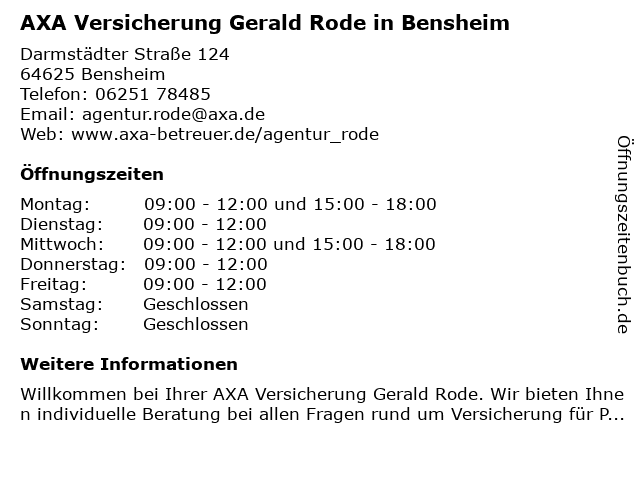 2 AXA Versicherung - Regionalvertretung Heinz Füchtenkordt (Entfernung: 1,85 km) Schwanheimer Str. 82, 64625 Bensheim 3 AXA Versicherung Holm Köhler Geschäftsstelle in Bensheim (Entfernung: 3,35 km) Altengassweg 18, 64625 Bensheim 6 AXA Versicherung - Hauptvertretung Karl-Heinz Szych (Entfernung: 12,39 km) Fahrenbacher St. 64, 64658 Fürth |