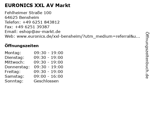 | Öffnungszeiten EURONICS XXL AV Markt in Bensheim anzeigen | |