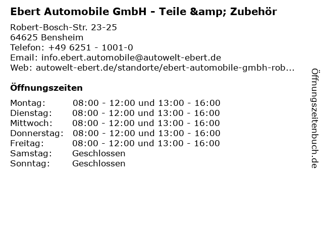 2 Ebert Automobile GmbH - Service Pkw (Entfernung: 0,01 km) Robert-Bosch-Straße 23 - 25, 64625 Bensheim 4 Mercedes-Benz Center Bensheim - Autowelt Ebert (Entfernung: 0,27 km) Robert-bosch-straße 36, 64625 Bensheim 5 Autohaus Ebert-Diehm GmbH & Co. KG - Service (Entfernung: 0,27 km) Robert-Bosch-Str. 36, 64625 Bensheim 6 Autohaus Ebert-Diehm GmbH & Co. KG - Original-Teile & Zubehör (Entfernung: 0,27 km) Robert-Bosch-Str. 36, 64625 Bensheim |