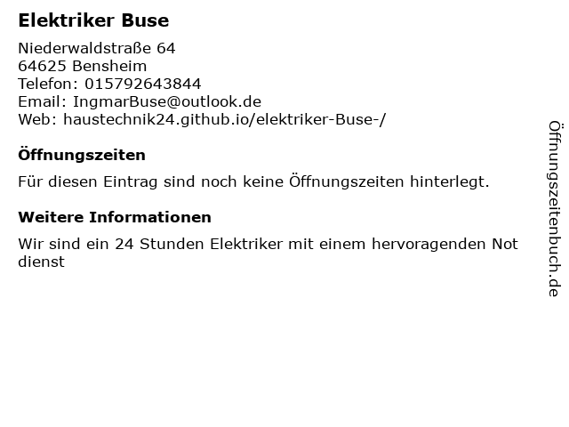 | Öffnungszeiten Elektriker Buse in Bensheim anzeigen | |