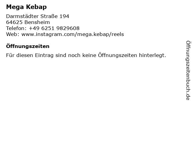 | Öffnungszeiten Mega Kebap in Bensheim anzeigen | |