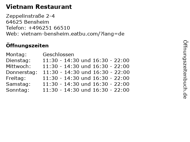 | Öffnungszeiten Vietnam Restaurant in Bensheim anzeigen | |