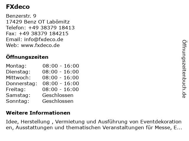 | Öffnungszeiten FXdeco in Benz OT Labömitz anzeigen | |
