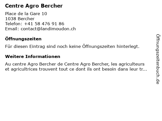 | Öffnungszeiten Centre Agro Bercher in Bercher anzeigen | |