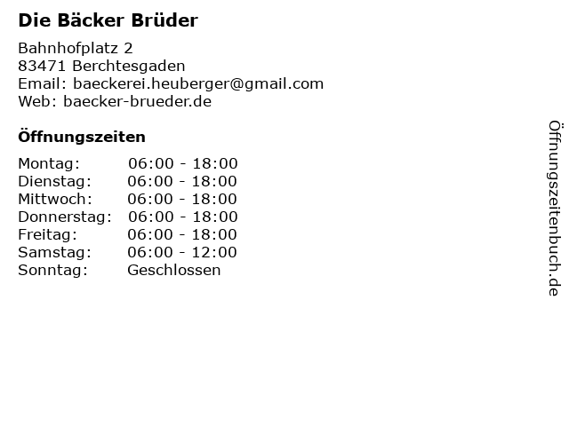 | Öffnungszeiten Die Bäcker Brüder in Berchtesgaden anzeigen | |