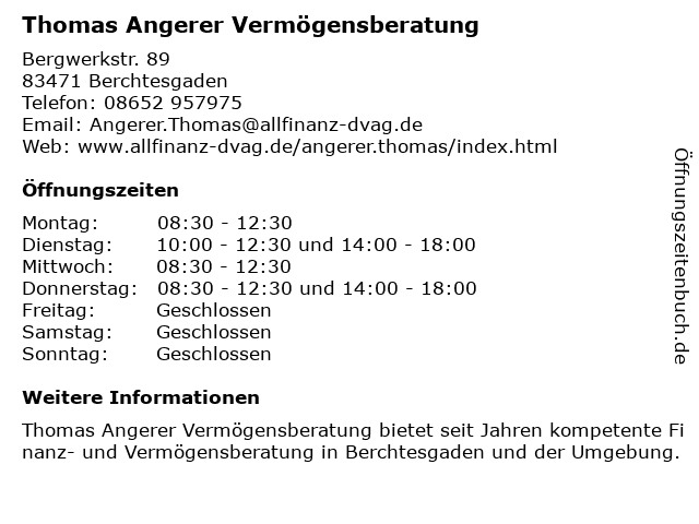 | 1 Allfinanz Deutsche Vermögensberatung Thomas Angerer (Entfernung: 0,01 km) Bergwerkstr. 89, 83471 Berchtesgaden 4 Angerer Hans Maler u. Trockenbau GmbH Niedrigenergiehäuser (Entfernung: 4,36 km) Silbergstr. 91, 83483 Bischofswiesen 6 Ludwig Angerer Malerbetrieb und Hausmeisterservice (Entfernung: 5,61 km) Tiefenbachstr. 75, 83487 Marktschellenberg |