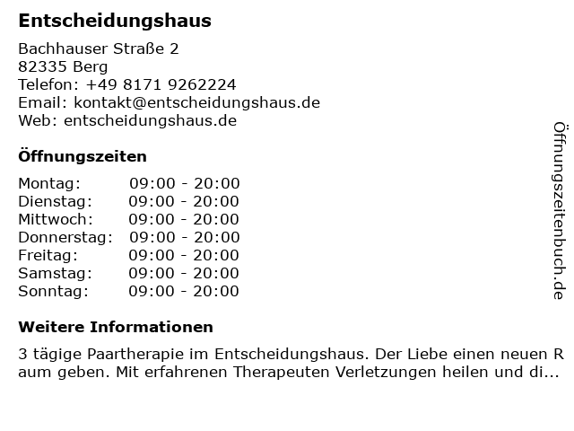 | Öffnungszeiten Entscheidungshaus in Berg anzeigen | |