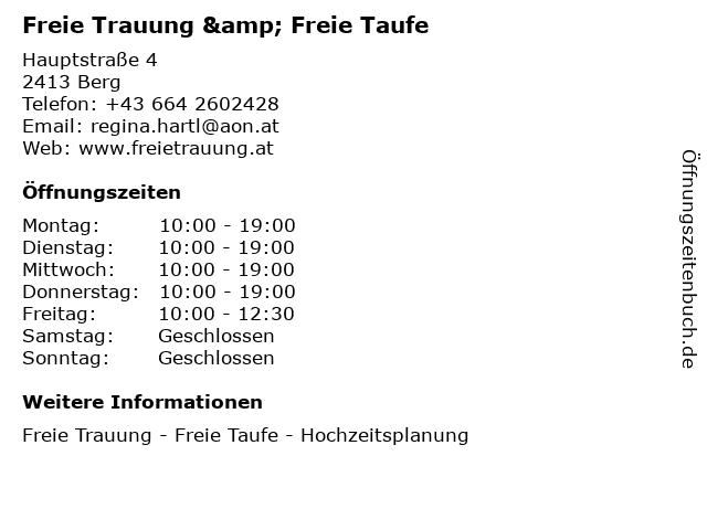 Öffnungszeiten Freie Trauung & Freie Taufe in Berg anzeigen