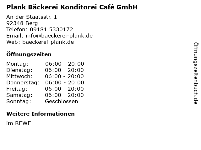 3 Bäckerei Konditorei Cafe Plank GmbH (Entfernung: 1,11 km) Neumarkter Straße 38, 92348 Berg bei Neumarkt in der Oberpfalz 4 Bäckerei Konditorei Cafe Plank GmbH (Entfernung: 3,91 km) EFA-Straße 6, 92318 Neumarkt in der Oberpfalz 5 Bäckerei Konditorei Cafe Plank GmbH (Entfernung: 4,45 km) Obere Marktstraße 49, 92318 Neumarkt in der Oberpfalz 6 Plank Bäckerei Konditorei Café GmbH - BrotZEIT #2 (Entfernung: 4,72 km) Hans-Dehn-Straße 3, 92318 Neumarkt |