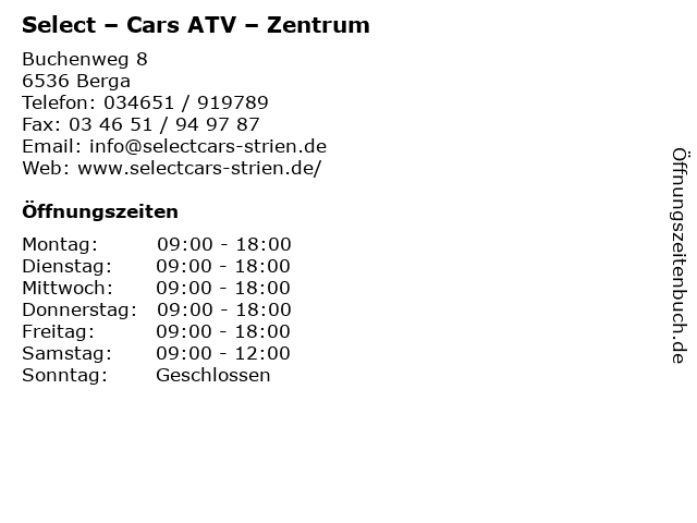 | Öffnungszeiten Select – Cars ATV – Zentrum in Berga anzeigen | |