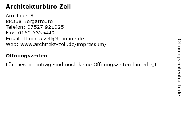 | Öffnungszeiten Architekturbüro Zell in Bergatreute anzeigen | |
