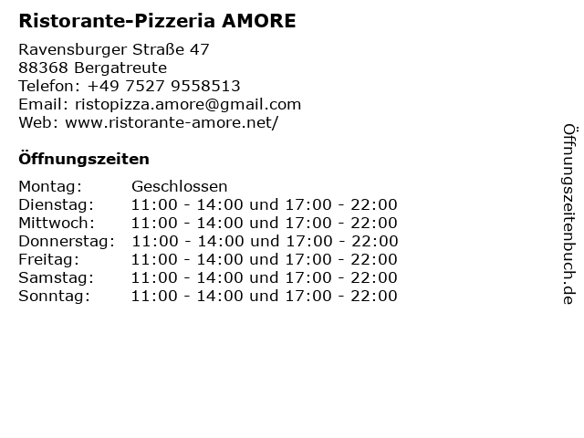 Ristorante-Pizzeria AMORE in Bergatreute: Telefonnummer, Öffnungszeiten und Adresse