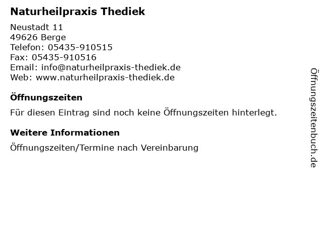 | Öffnungszeiten Naturheilpraxis Thediek in Berge anzeigen | |