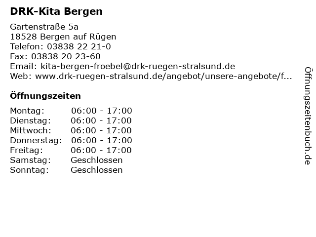 | Öffnungszeiten DRK-Kita Bergen in Bergen auf Rügen anzeigen | |