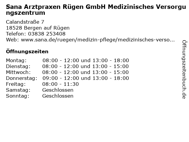 3 SANA-Krankenhaus Rügen GmbH - Bereitschaftspraxis (Entfernung: 0,06 km) Calandstraße 7, 18528 Bergen auf Rügen 6 |
