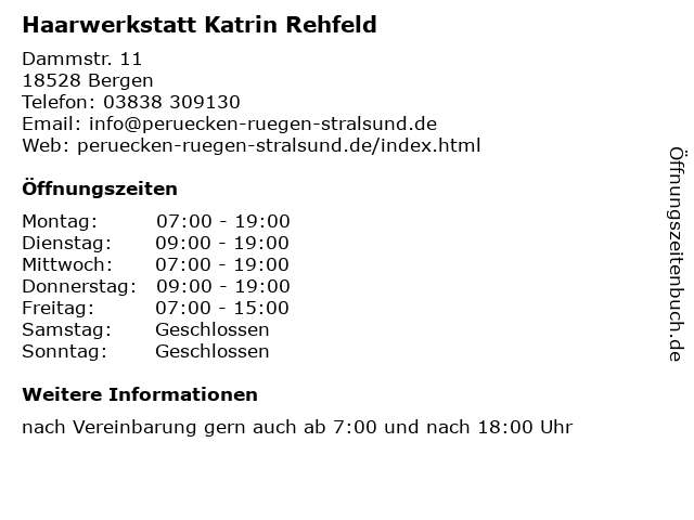 | Öffnungszeiten Haarwerkstatt Katrin Rehfeld in Bergen anzeigen | |