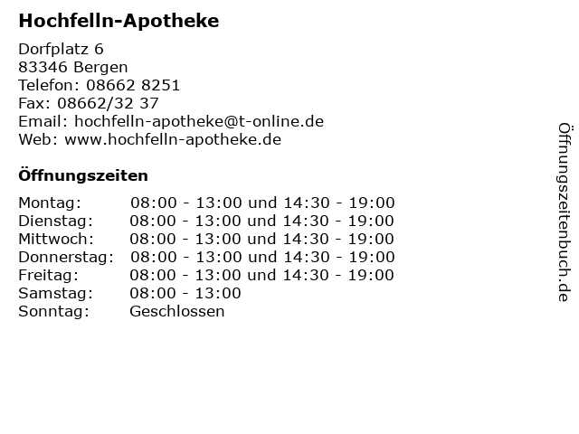 | Öffnungszeiten Hochfelln-Apotheke in Bergen anzeigen | |