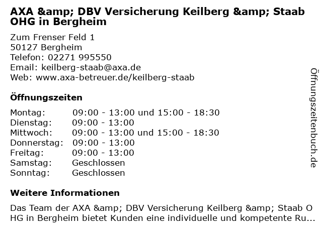 Branchen & Suchbegriffe zu AXA & DBV Versicherung Keilberg & Staab OHG in Bergheim:altersvorsorge, autoversicherung, axa, berufshaftpflichtversicherung, dbv, gebäude- und hausratsversicherung, keilberg, kfz-versicherung (motorrad), lebensversicherung, staab, unternehmen für versicherungsfachfragen, versicherung, zahnmedizinische versicherung |