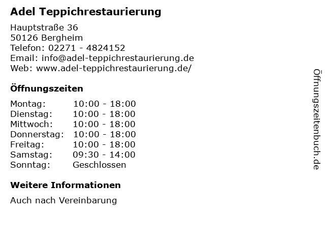 | Öffnungszeiten Adel Teppichrestaurierung in Bergheim anzeigen | |