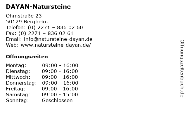 | Öffnungszeiten DAYAN-Natursteine in Bergheim anzeigen | |