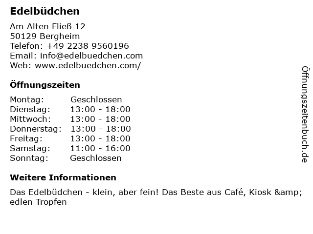 | Öffnungszeiten Edelbüdchen in Bergheim anzeigen | |