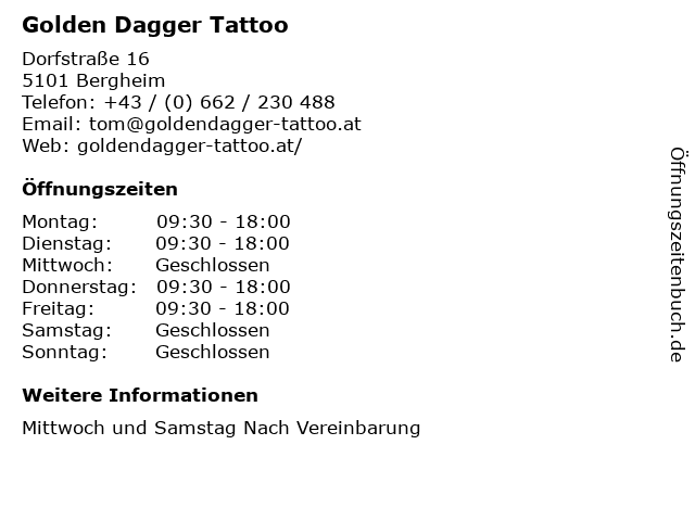 | Telefonnummer Golden Dagger Tattoo in Bergheim (+43 / (0) 662 / 230 488) anrufen | |