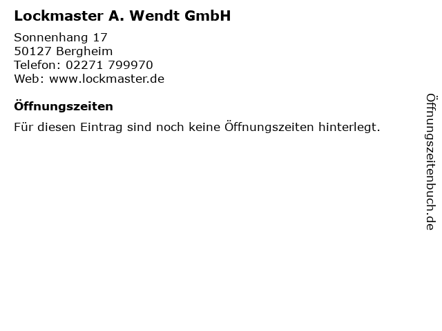 | Öffnungszeiten Lockmaster A. Wendt GmbH in Bergheim anzeigen | |