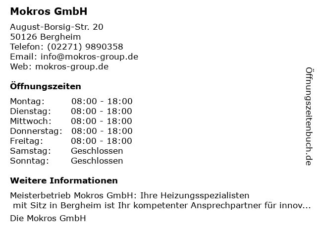 | Öffnungszeiten Mokros GmbH in Bergheim anzeigen | |