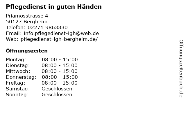 4 Pflegezentrum Brünger-Versen UG Pflegedienst (Entfernung: 11,61 km) Blumachergasse 5 B, 50259 Pulheim 6 |