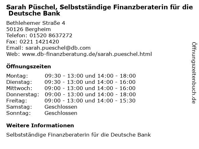 Branchen & Suchbegriffe zu Sarah Püschel, Selbstständige Finanzberaterin für die Deutsche Bank:bank, deutsche, finanzberaterin, püschel, sarah, selbstständige |