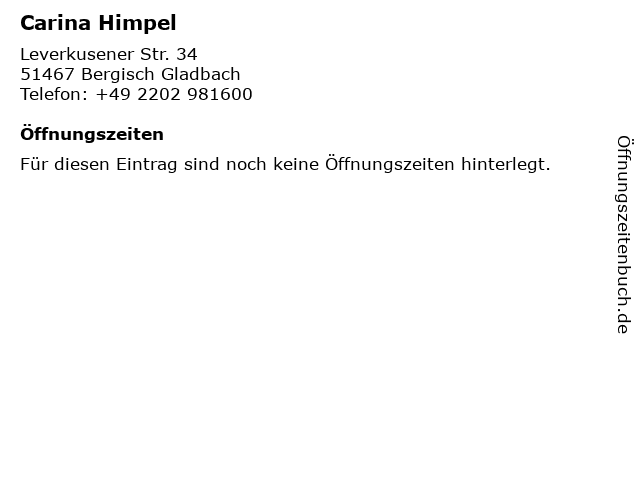 | Öffnungszeiten Carina Himpel in Bergisch Gladbach anzeigen | |