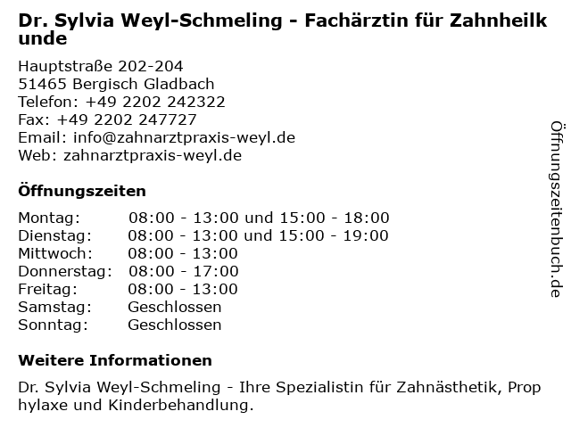 Branchen & Suchbegriffe zu Dr. Sylvia Weyl-Schmeling - Fachärztin für Zahnheilkunde:cerec, dr., endodontie, fachärztin, implantologie, invisalign, kinderzahnarzt, parodontologie, prophylaxe, schmeling, schnarchtherapie, sylvia, weyl, zahnarztpraxis, zahnersatz, zahnersatz an einem tag, zahnheilkunde, zahnregulierung, zahnwurzelbehandlung, zahnästhetik |