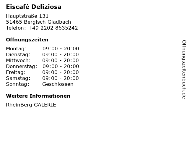 | Öffnungszeiten Eiscafé Deliziosa in Bergisch Gladbach anzeigen | |