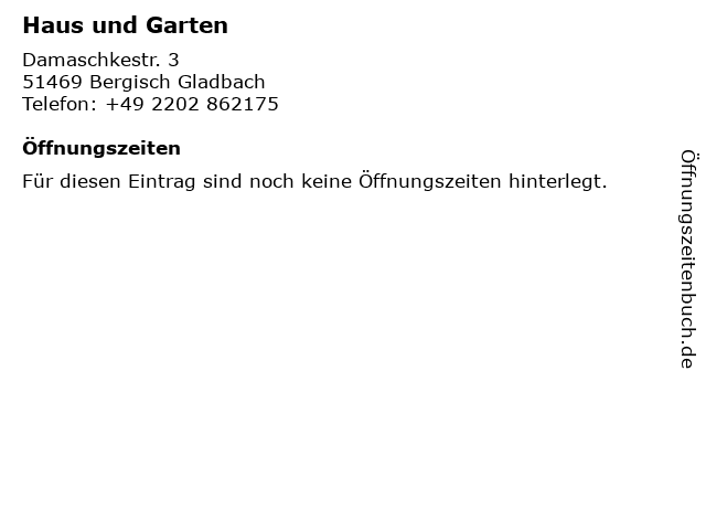 | Öffnungszeiten Haus und Garten in Bergisch Gladbach anzeigen | |