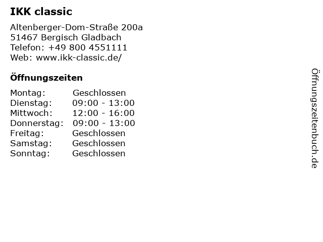 | Öffnungszeiten IKK classic in Bergisch Gladbach anzeigen | |