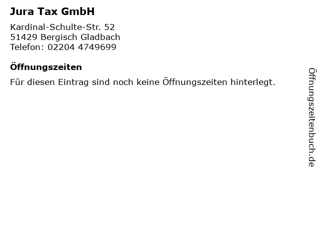 | Öffnungszeiten Jura Tax GmbH in Bergisch Gladbach anzeigen | |