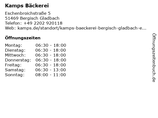 | Öffnungszeiten Kamps Bäckerei in Bergisch Gladbach anzeigen | |