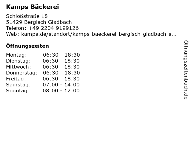 | Öffnungszeiten Kamps Bäckerei in Bergisch Gladbach anzeigen | |