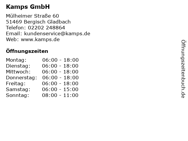 | Öffnungszeiten Kamps GmbH in Bergisch Gladbach anzeigen | |