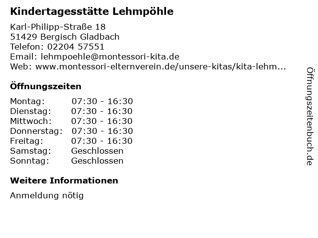 1 Fröbel Offener Ganztag (OGATA) Lehmpöhle (Entfernung: 0,58 km) Saaler Mühle 8, 51429 Bergisch Gladbach 5 Alten- und Familienhilfe Bensberg e. V. - Sprechzeiten (Entfernung: 0,72 km) Im Bungert 3, 51429 Bergisch Gladbach 6 Kleiderstube Ev. Kirchengemeinde Bensberg - Annahme (Entfernung: 0,72 km) Im Bungert 3, 51429 Bergisch Gladbach |